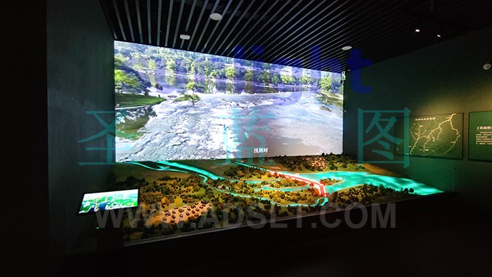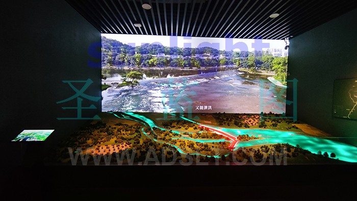 該項目采用,多通道投影機融合大屏幕、觸摸屏、光電沙盤,三者互動的方式,向游客展示靈渠的相關介紹動畫視頻,游客可以通過在觸摸屏上點選想了解的知識點內容,游客點選后,大屏幕上播放相關的介紹視頻,光電沙盤上對應的部分做燈光表演。