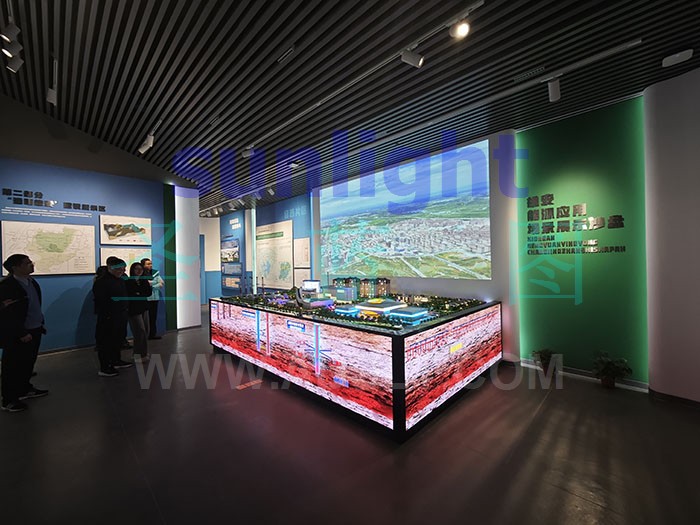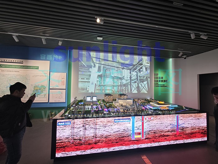該項目,采用投影大屏幕、電動光電升降沙盤以及沙盤底座側(cè)面LED屏的方式,系統(tǒng)的講述雄安能源應(yīng)用的各種場景。